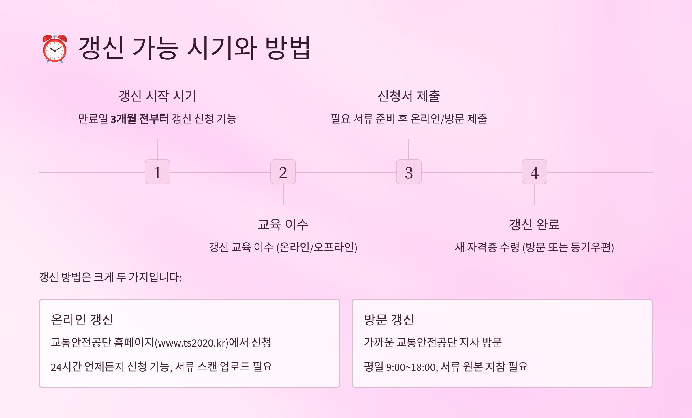 갱신은 온라인 또는 지정된 교육기관 방문을 통해 할 수 있어요. 다만 온라인으로만 가능한 기간이 정해져 있고, 일정 이후에는 방문 신청만 가능하다는 점 참고하세요.