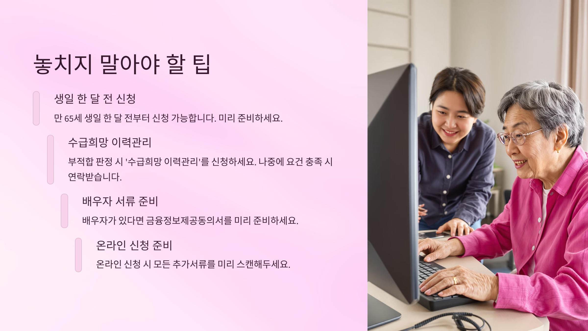 기초연금은 단순히 연령과 소득만 맞춘다고 되는 게 아니에요. 몇 가지 세부 팁들을 알고 있으면 탈락 없이 안정적으로 받을 수 있어요. 특히 매년 신청자 중 많은 분들이 '서류 미비'로 인해 불이익을 겪는 경우가 많아요.