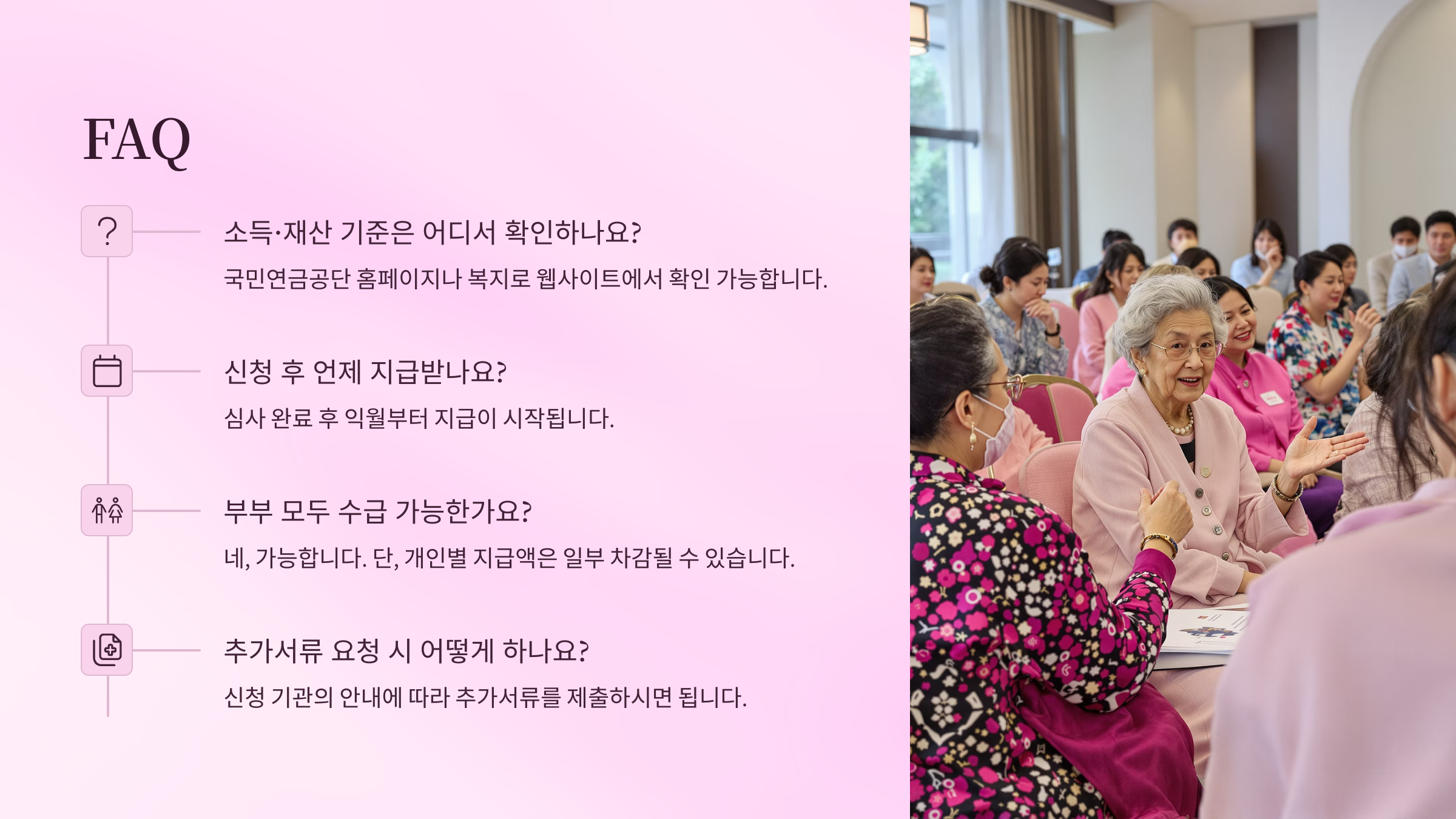 신청 대상은 국민연금 가입 여부와 관계없어요. 국민연금을 받는 사람도, 받지 않는 사람도 기초연금 대상이 될 수 있어요. 다만 국민연금 수급액이 많으면 기초연금 일부가 감액될 수 있답니다. 참고로 기초생활수급자도 중복 수급 가능해요!
