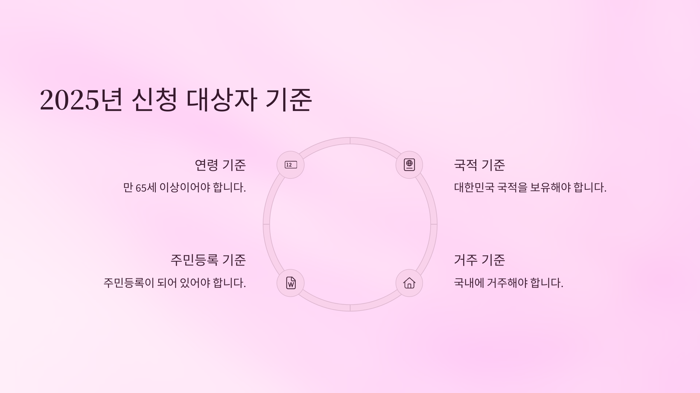 2025년 기초연금의 기본 신청 자격은 '만 65세 이상'이에요. 정확히는 생일 기준으로 해당 연도에 65세가 되는 사람부터 신청할 수 있어요. 올해는 1960년생이 해당돼요. 생년월일이 빠르면 2025년 1월부터, 느리면 하반기부터 대상이 될 수 있어요.