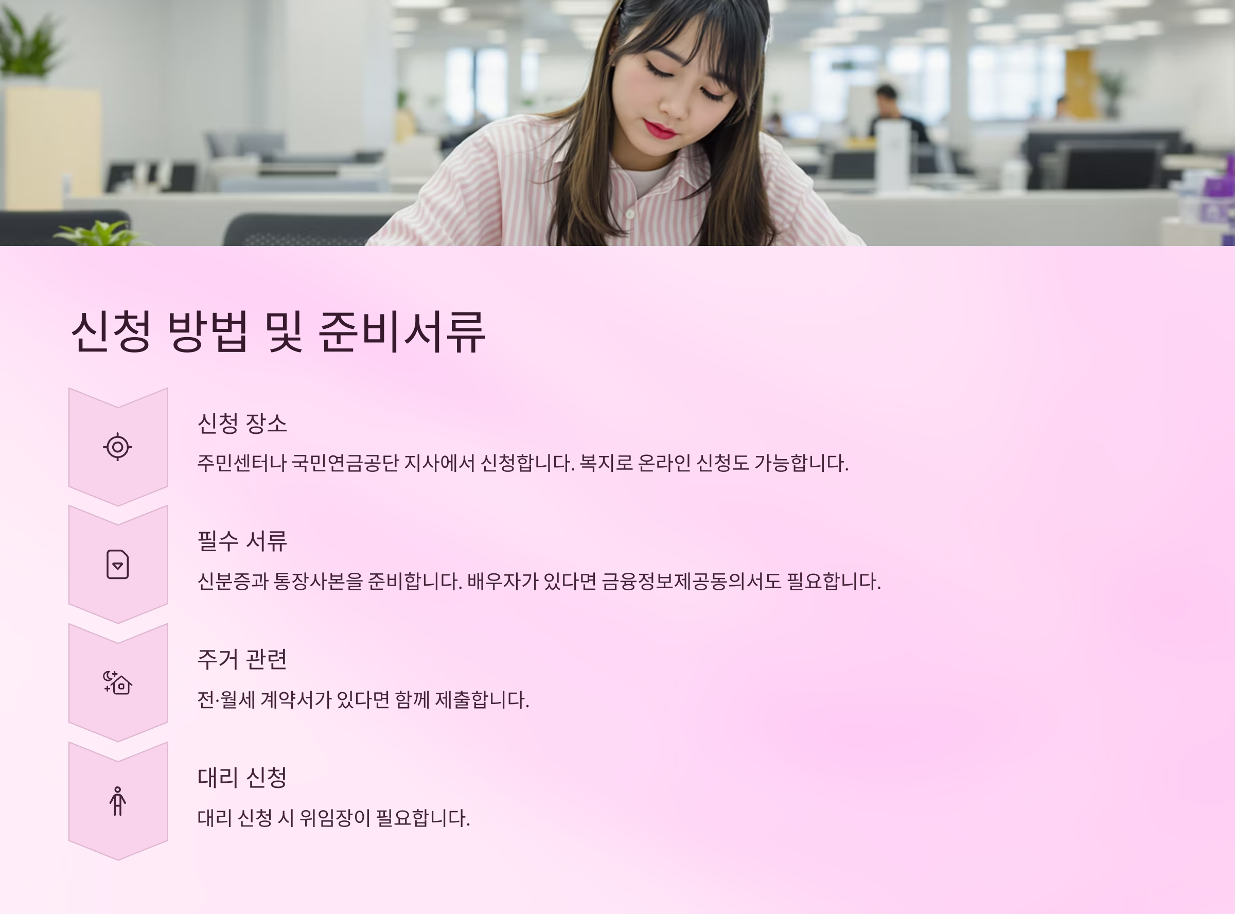 신청은 크게 두 가지 방법으로 가능해요. 하나는 가까운 '읍면동 주민센터'를 방문해서 접수하는 방법, 다른 하나는 인터넷을 통해 '복지로(www.bokjiro.go.kr)'에서 비대면 신청하는 방법이에요. 둘 다 어렵지 않지만, 서류 준비는 꼼꼼히 해야 해요.