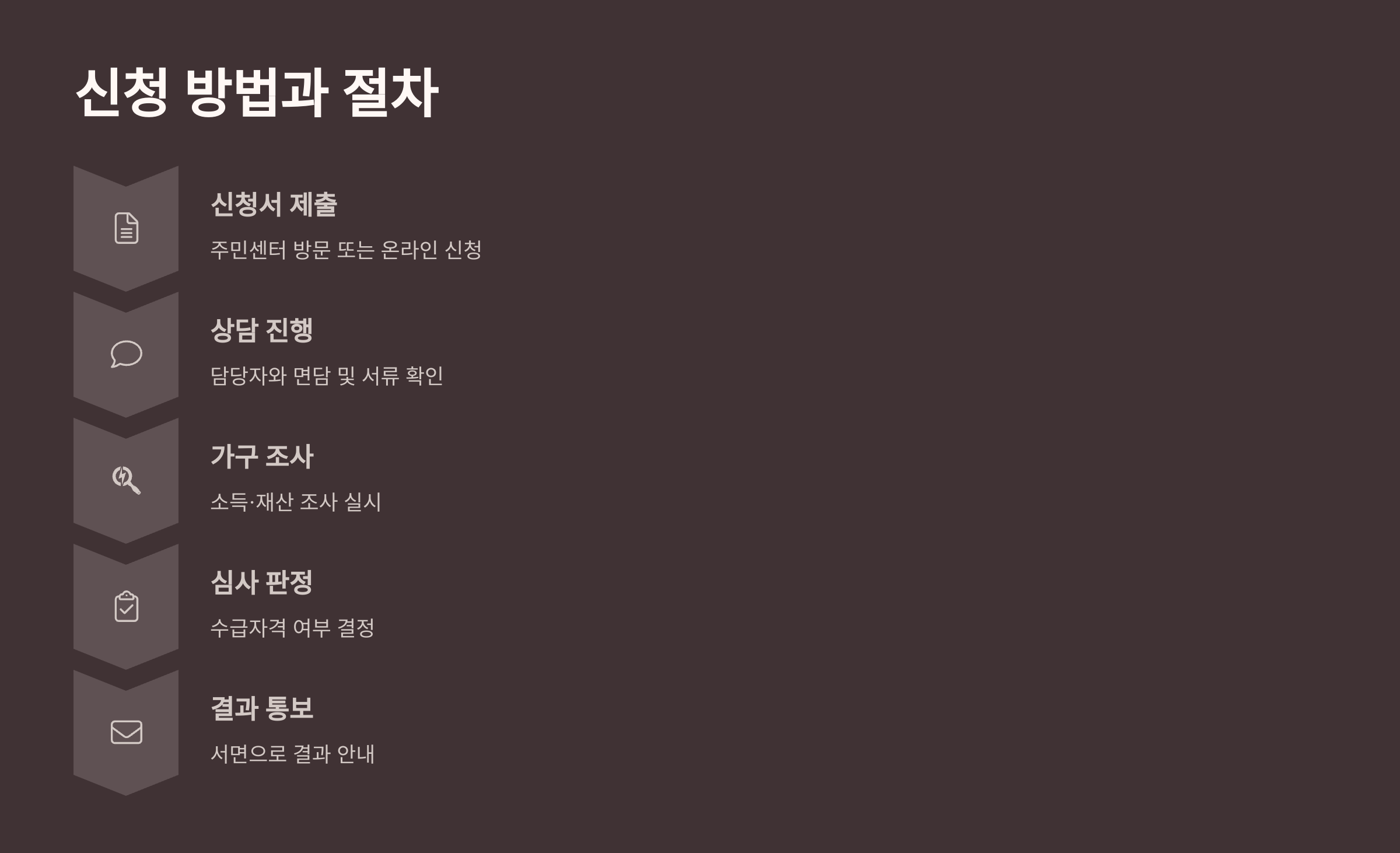 신청은 본인이 직접 할 수도 있고, 가족 또는 법정대리인을 통해서도 가능해요. 신청서 제출 후에는 소득·재산조사와 부양의무자 확인 과정을 거치게 돼요. 이때 시간이 조금 걸릴 수 있지만, 보통 30일 이내에 결과를 받을 수 있어요.