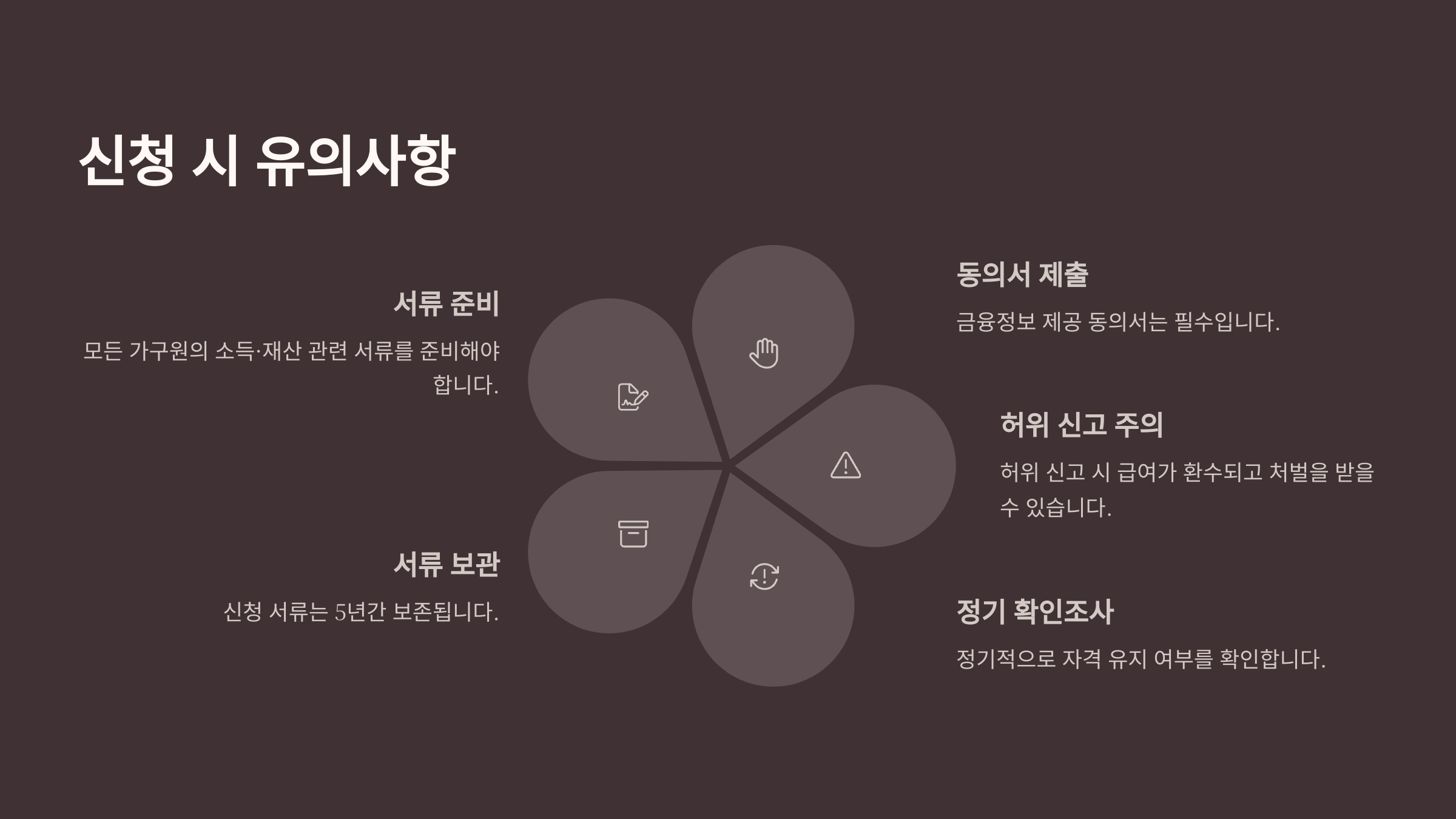 기초생활수급자 신청할 때는 몇 가지 유의할 점이 있어요. 가장 중요한 건 정확한 정보 제공이에요. 소득이나 재산을 축소하거나 누락하면 부정수급으로 간주되어 추후 환수는 물론, 형사처벌까지 받을 수 있어요.