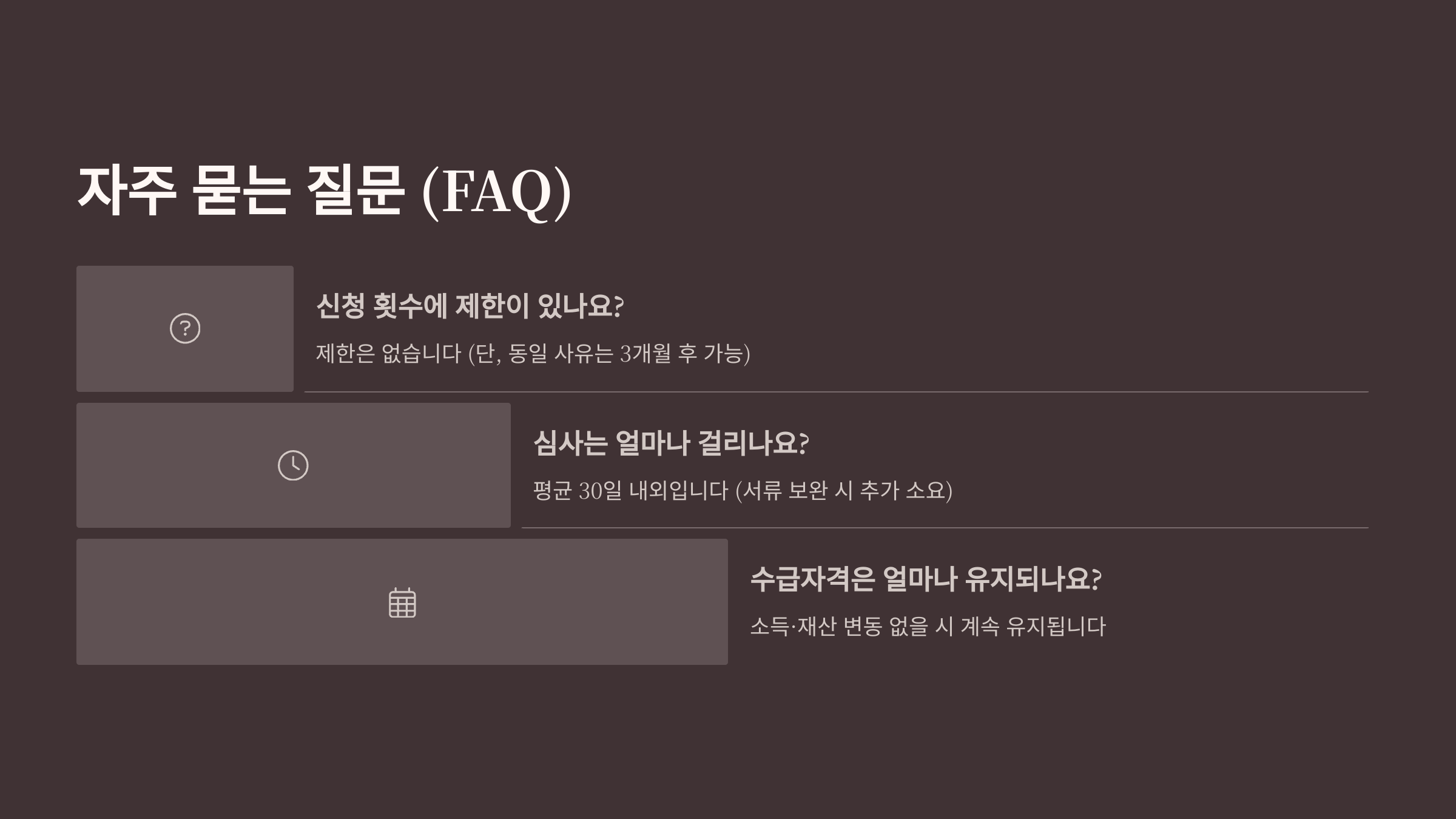 세 번째는 신청 간소화예요. 기존에는 구비서류가 많고, 제출 형식이 까다로웠지만 2025년부터는 행정정보 공동이용망을 통해 일부 서류를 자동 조회할 수 있도록 개선됐어요. 이제 주민센터를 몇 번씩 오가지 않아도 되니 훨씬 편해졌답니다.😄