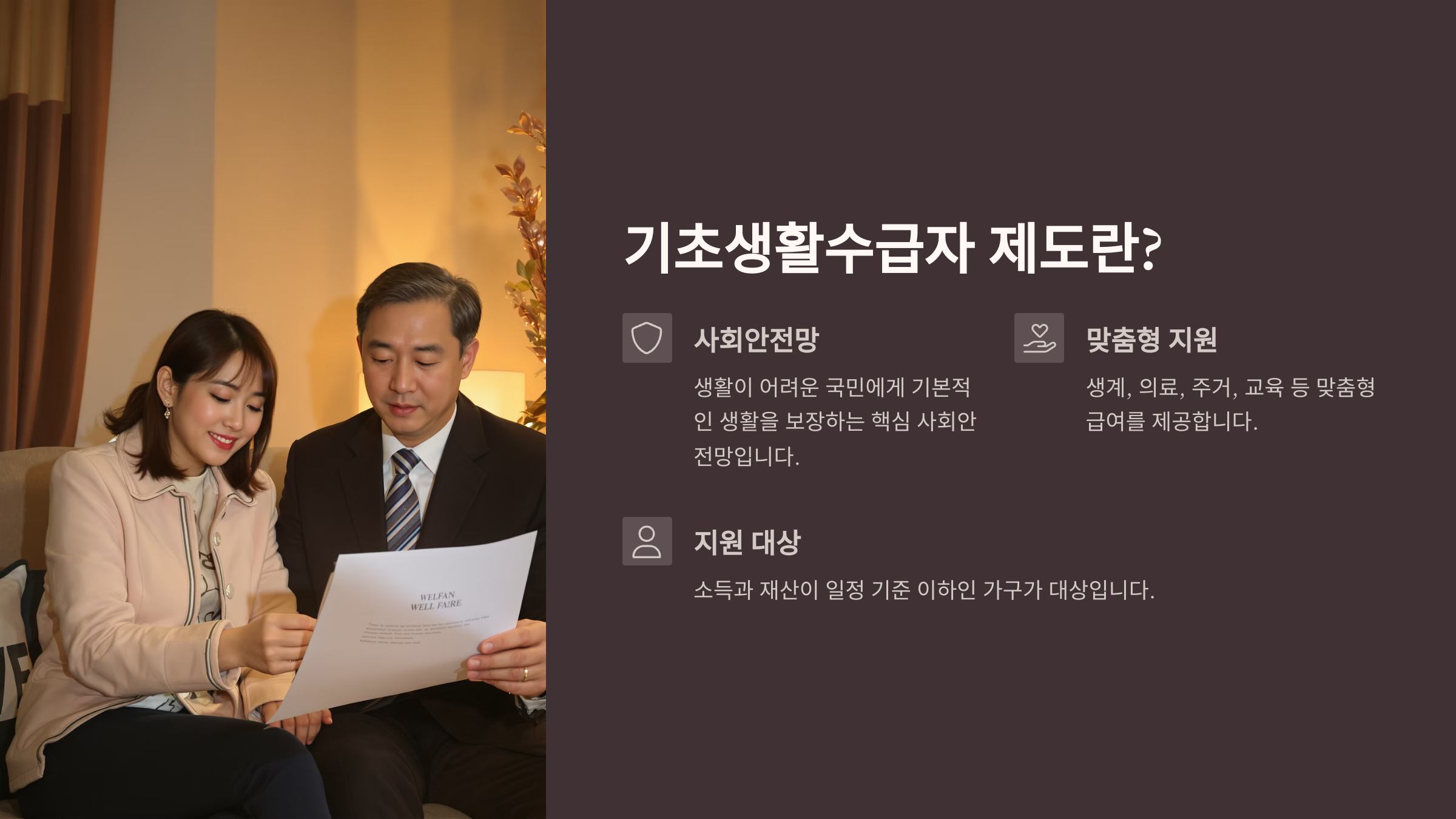 기초생활수급자 제도는 소득이 일정 수준 이하인 국민에게 생계, 주거, 교육, 의료 등의 기본 생활을 지원하는 중요한 사회보장제도예요.